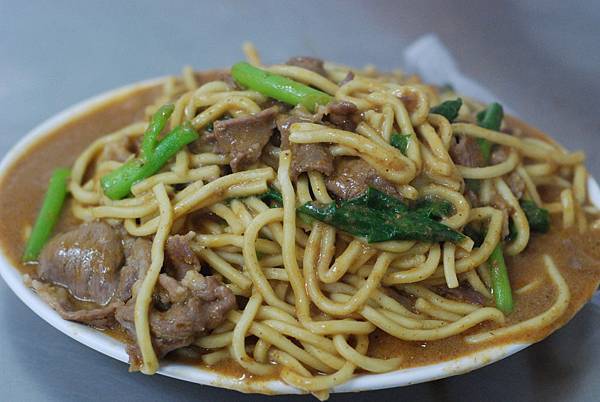 接著重頭戲來了,羊肉炒麵使用的是烏龍麵的粗麵條,配上青菜與沙茶醬,口味有點重,不過我覺得羊肉的肉質有點老,沙茶也很油,吃完炒麵剩下的全部都是沙茶的油...。