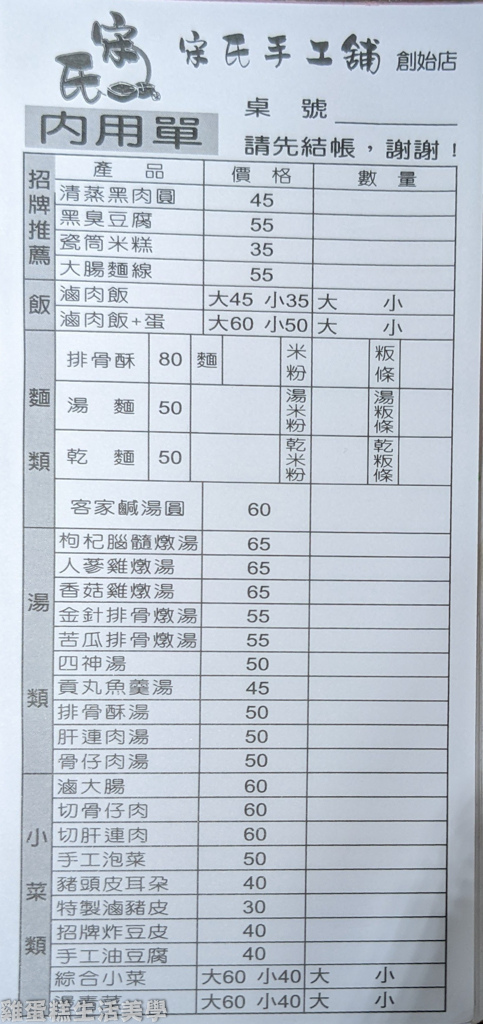 ▲宋氏手工舖菜單:除了招牌的米糕、麵線、臭豆腐、肉圓外,還有飯類、麵類、湯類和小菜可選。