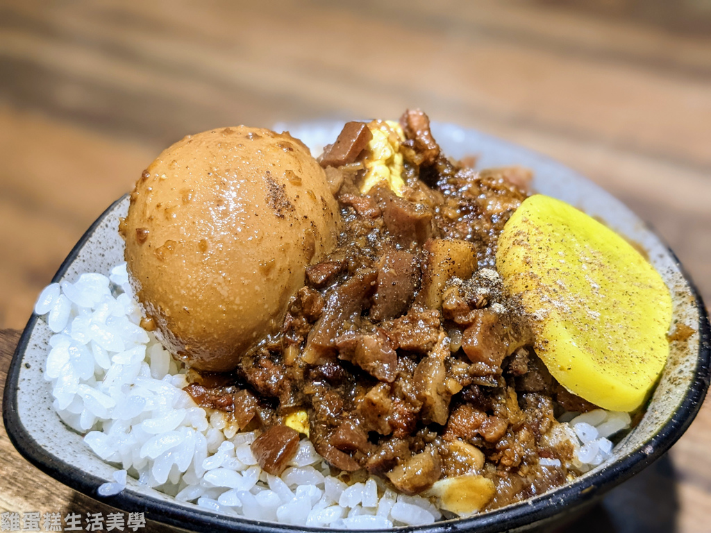 ▲魯肉飯(小)+蛋 50元,小份的份量算蠻大,滷肉以帶皮的肥肉為主,配上常見的醃黃蘿蔔,最後灑上白胡椒提味。
