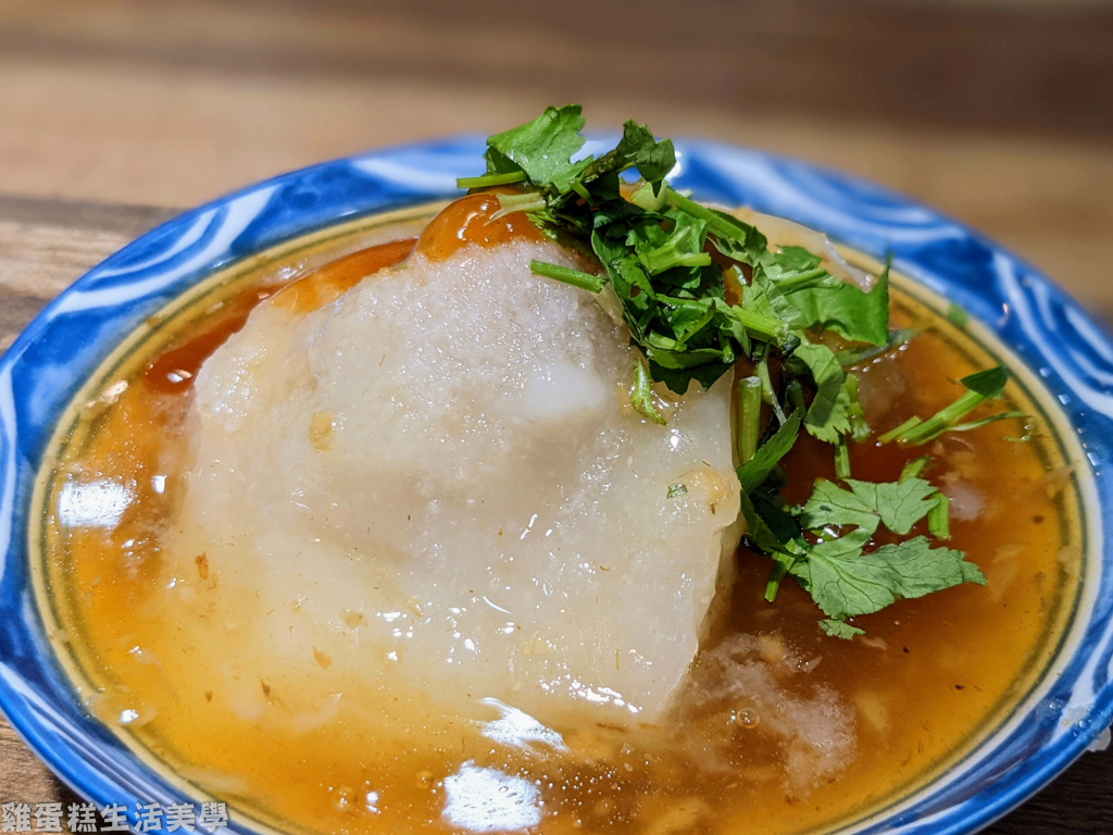 ▲清蒸黑肉圓 45元,他們的肉圓外皮是屬於軟嫩類型,跟油泡Q彈口感較不同,表面淋上的蒜末和醬汁相當夠味!