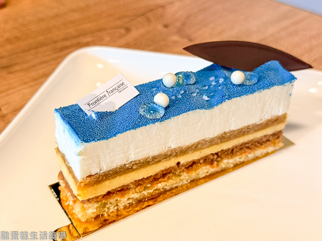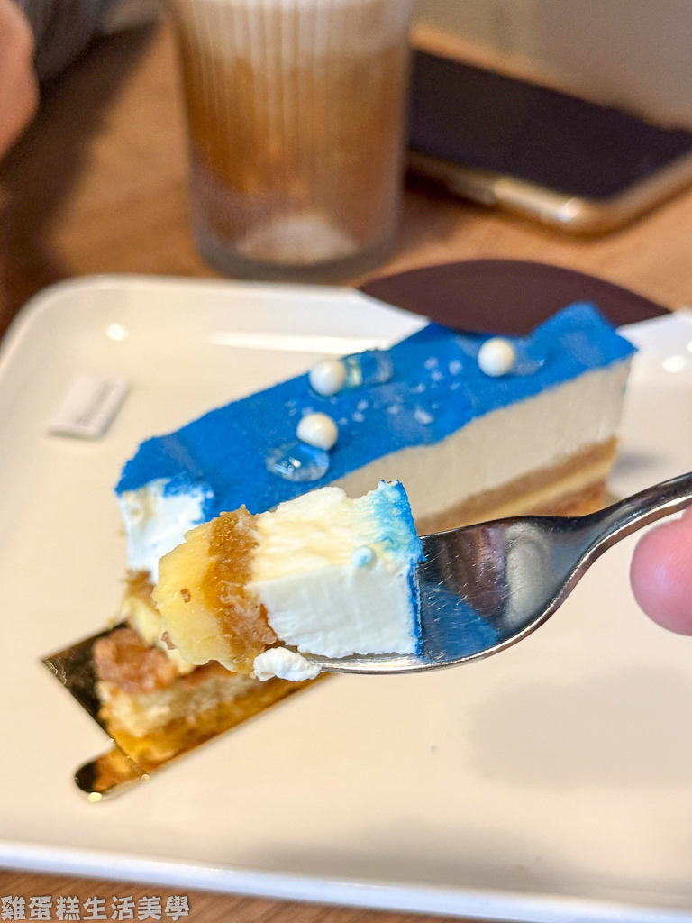 ▲追浪 180元:追浪是以海洋的意象為發想,外觀充滿海洋藍色的元素,蛋糕使用香草海鹽白巧慕斯、鳳梨果醬與奶餡花生帕林搭配跳跳糖,慕斯口感滑順不死甜,底層有花生的香氣和跳跳糖的刺激口感,即具創意。