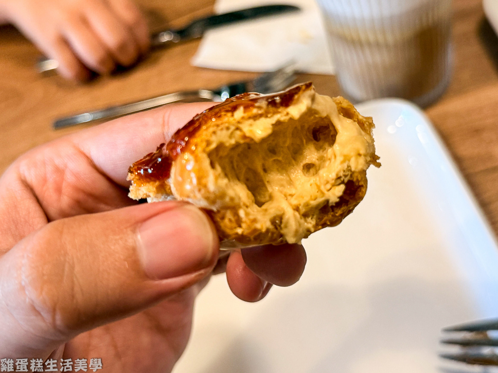 ▲焦糖鹽花閃電(泡芙)105元:表層裹上厚厚的的焦糖,吃起來有濃郁焦糖香氣,脆脆的口感非常棒,泡芙內餡有香草、奶油、麵粉、吉利丁,是非常有水準的甜點。