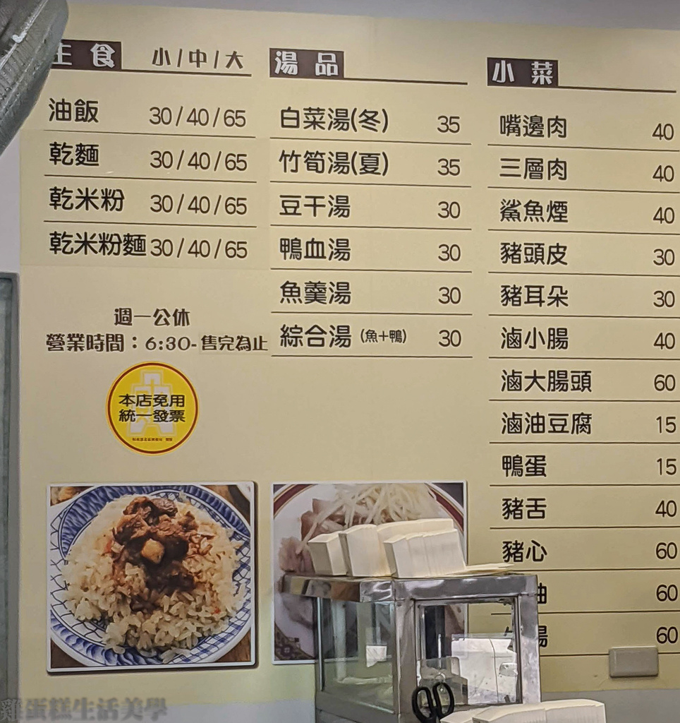 ▲菜單:油飯和麵類皆有分小中大,小份跟中份差10元,中份根大份差25元。