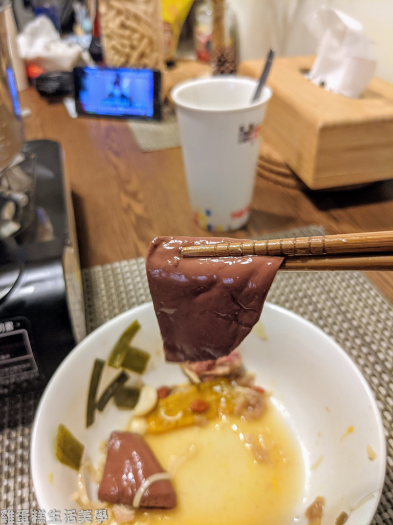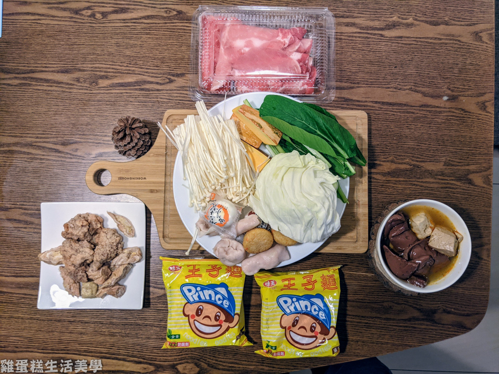▲我們外帶的兩人套餐,內容物為蒙古養身湯底(附鴨血和豆腐)、王子麵兩包、排骨酥、蔬菜、金針菇、南瓜、餃類,但兩人吃覺得有些不夠,建議加點其他配料。