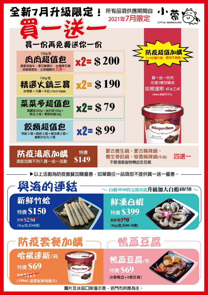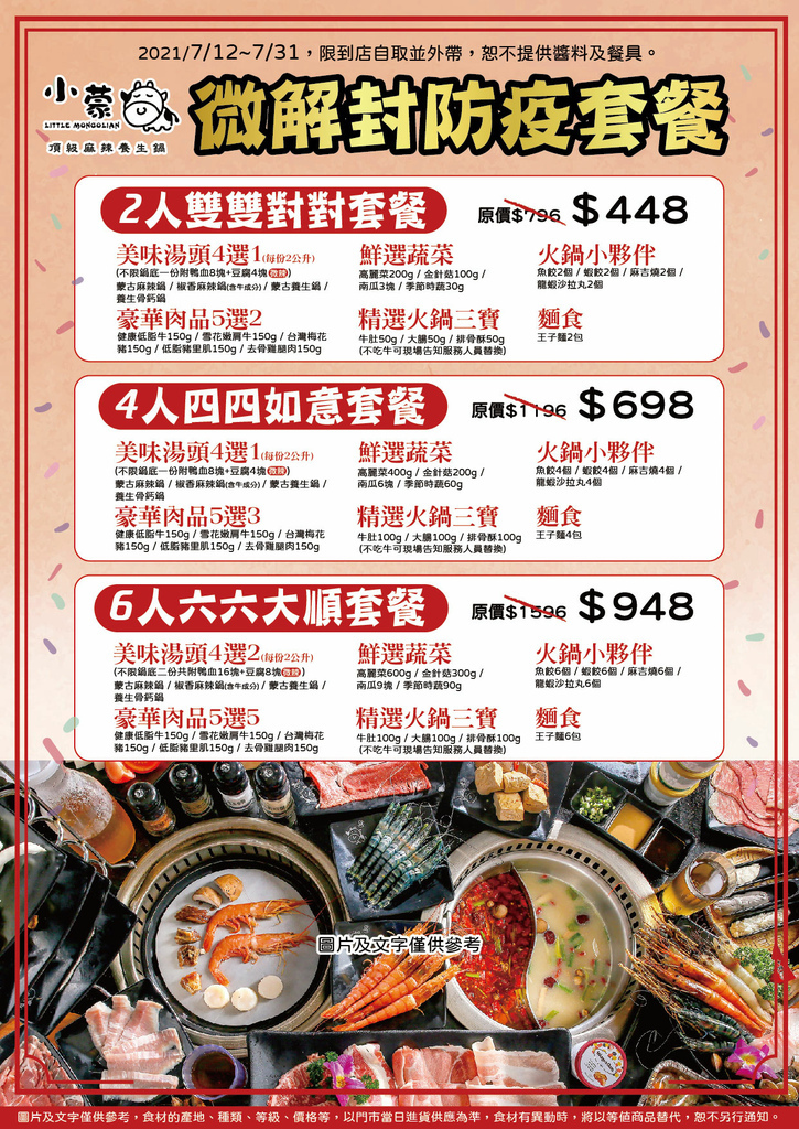 這陣子疫情的關係,許多餐廳紛紛推出許多外帶優惠,這次小蒙牛火鍋推出了防疫套餐5折的優惠(活動到七月底),比平常內用的價格便宜非常多,沒吃過小蒙牛的我們就藉此機會品嘗一下。