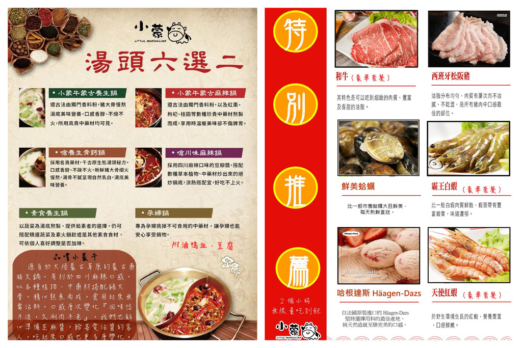 ▲小蒙牛菜單:湯頭可以六選二做鴛鴦鍋,其他食材菜單都有詳細介紹,每桌會發一個QR code自行使用手機點餐。(菜單轉自小蒙牛FB官網)