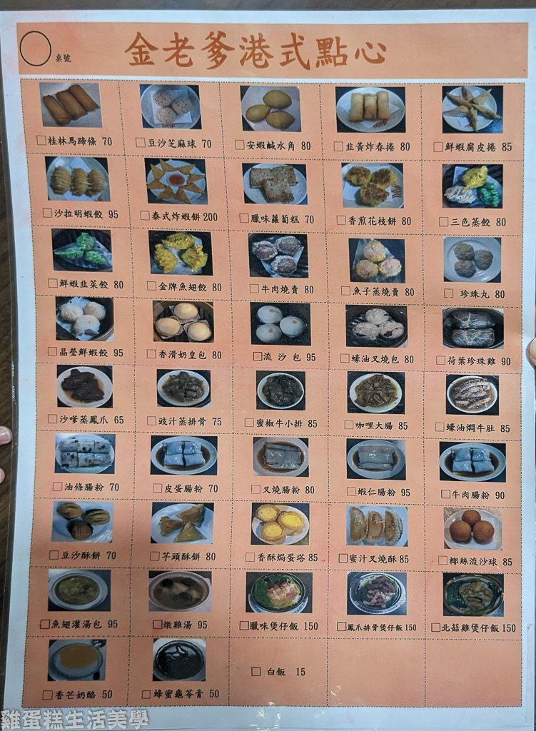 ▲金老爹港式點心菜單:有單點類的各式點心,如果有選擇障礙的人可直接點餐廳配好的2人、4人、8人套餐。