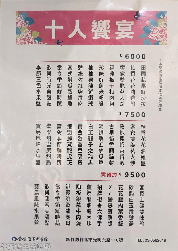 ▲全家福客家菜館菜單:十人套餐有三種組合可選擇。