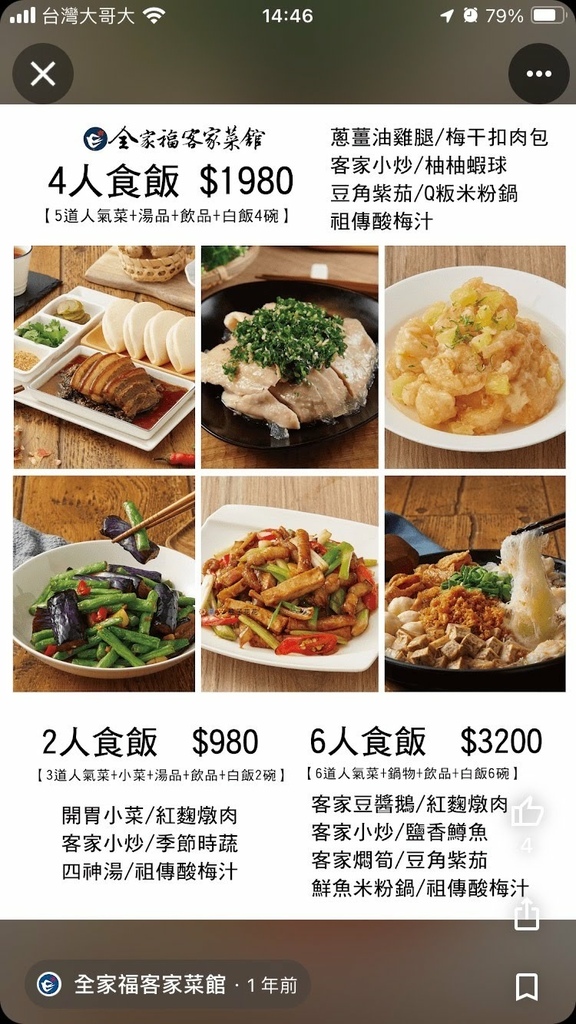 ▲全家福客家菜館菜單:有2人、4人,6人和8人組合餐,打星號的為店家推薦菜色。