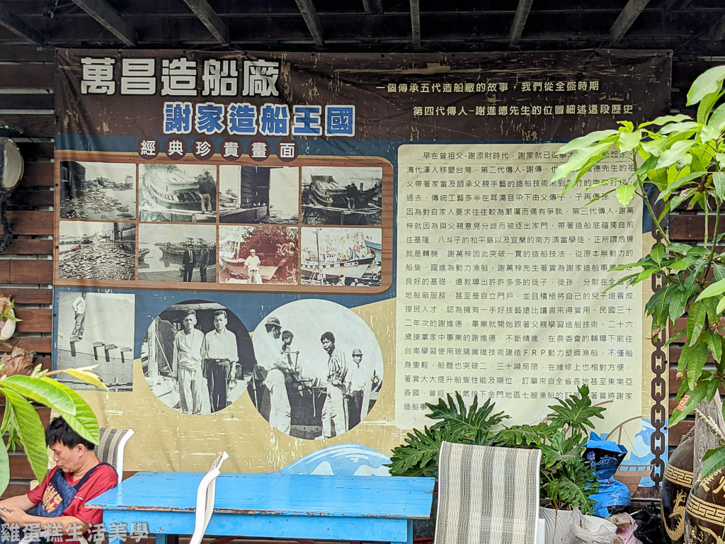 ▲餐廳周圍牆面上貼了許多關於造船廠的小故事,有興趣可以看看了解一下南寮漁港與謝家造船廠的歷史。