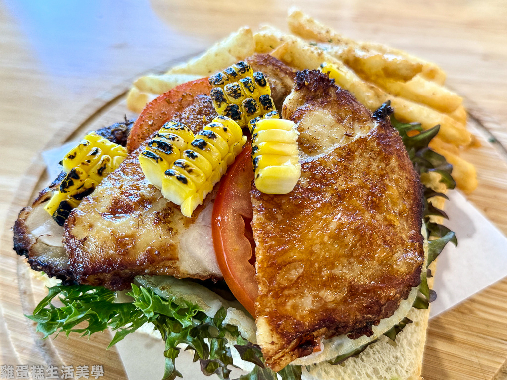 ▲炸雞腿開放三明治 350元:內有雞腿、生菜、醃菜、荷包蛋、番茄、玉米、薯條並搭配佛卡夏麵包,玉米烤得有些過焦,雞腿肉質極為厚實鮮嫩,吃起來沒有油膩感,再配上爽口的生菜和番茄,達到一個完美的平衡,薯條炸得酥酥的,不會過油或太乾。