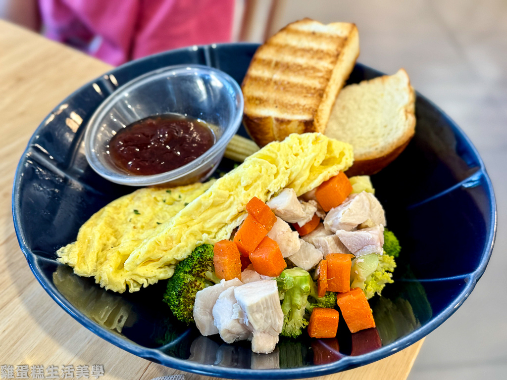 ▲小寶寶兒童餐 180元: 兒童餐內有雞丁、花椰菜、玉米筍、草莓果醬、炒蛋、吐司,雞丁和花椰菜是水煮的,無鹽無油非常健康,吐司有烤過吃起來酥酥的,配上甜甜的草莓醬小朋友都超愛。