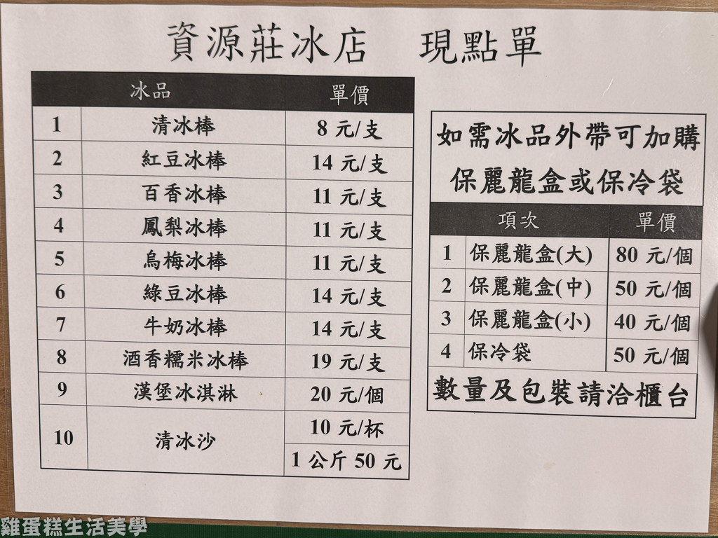 ▲中油資源莊冰店菜單:有八種口味的冰棒,還有很受歡迎的清冰沙、漢堡冰淇淋。